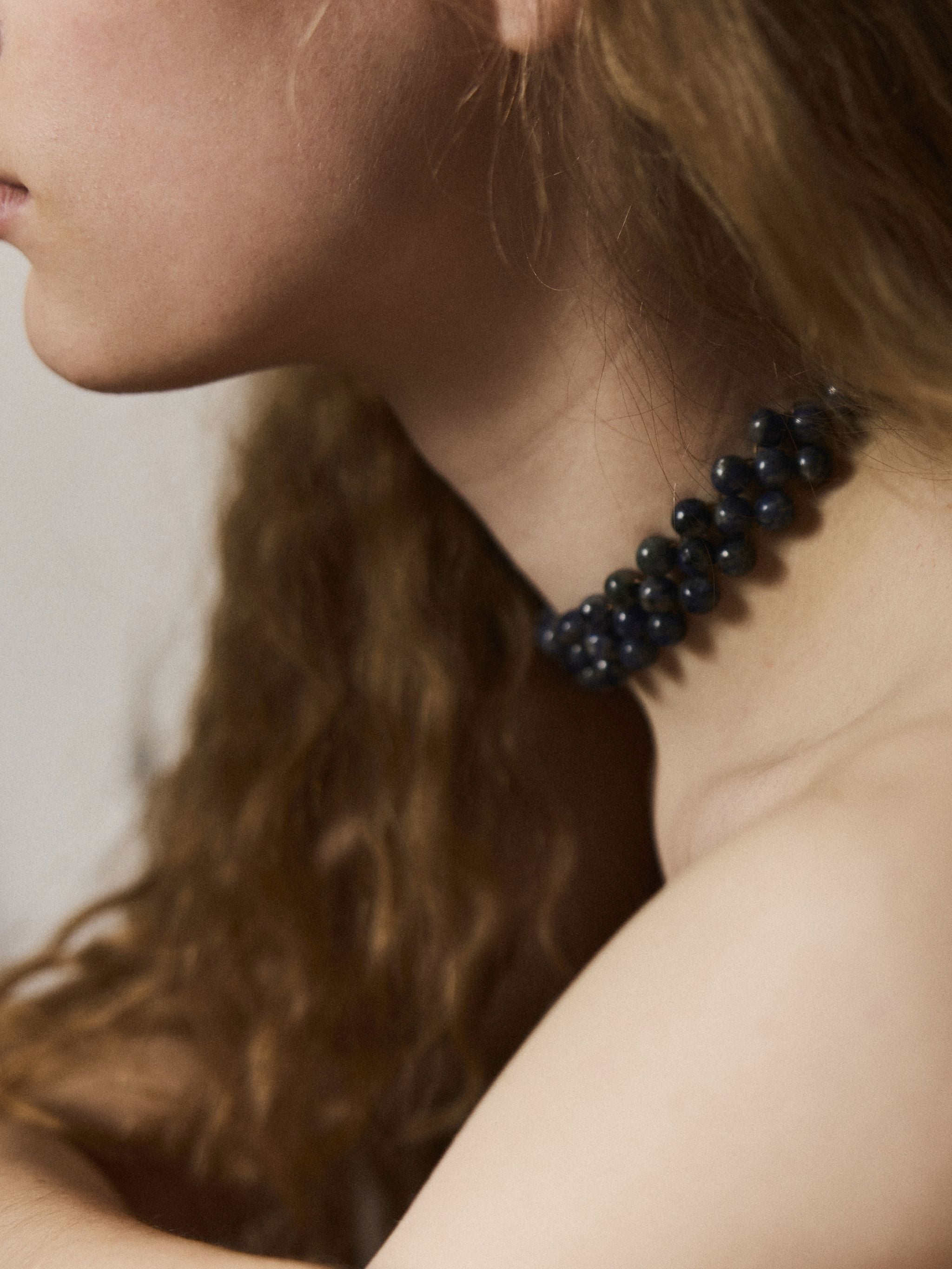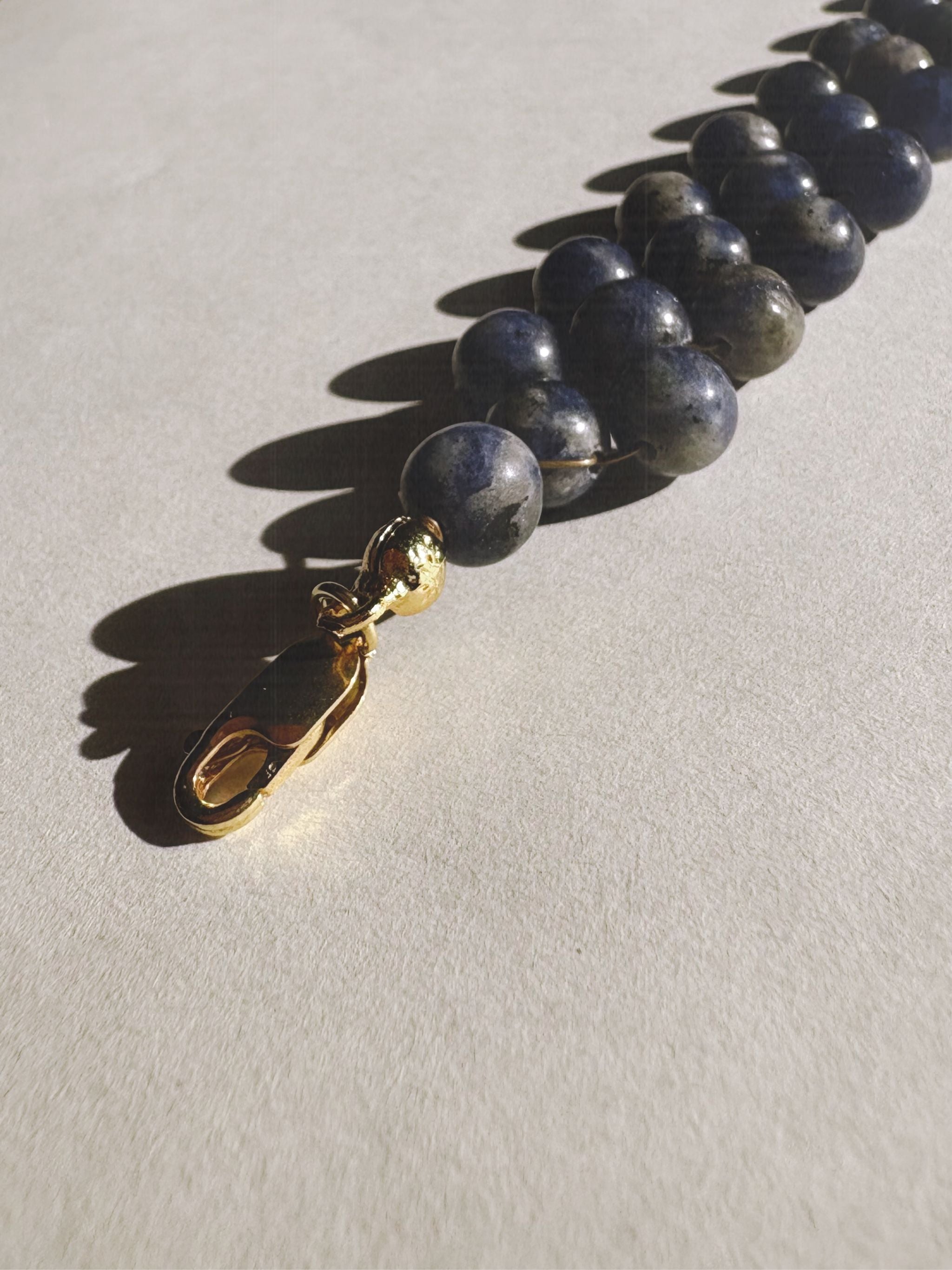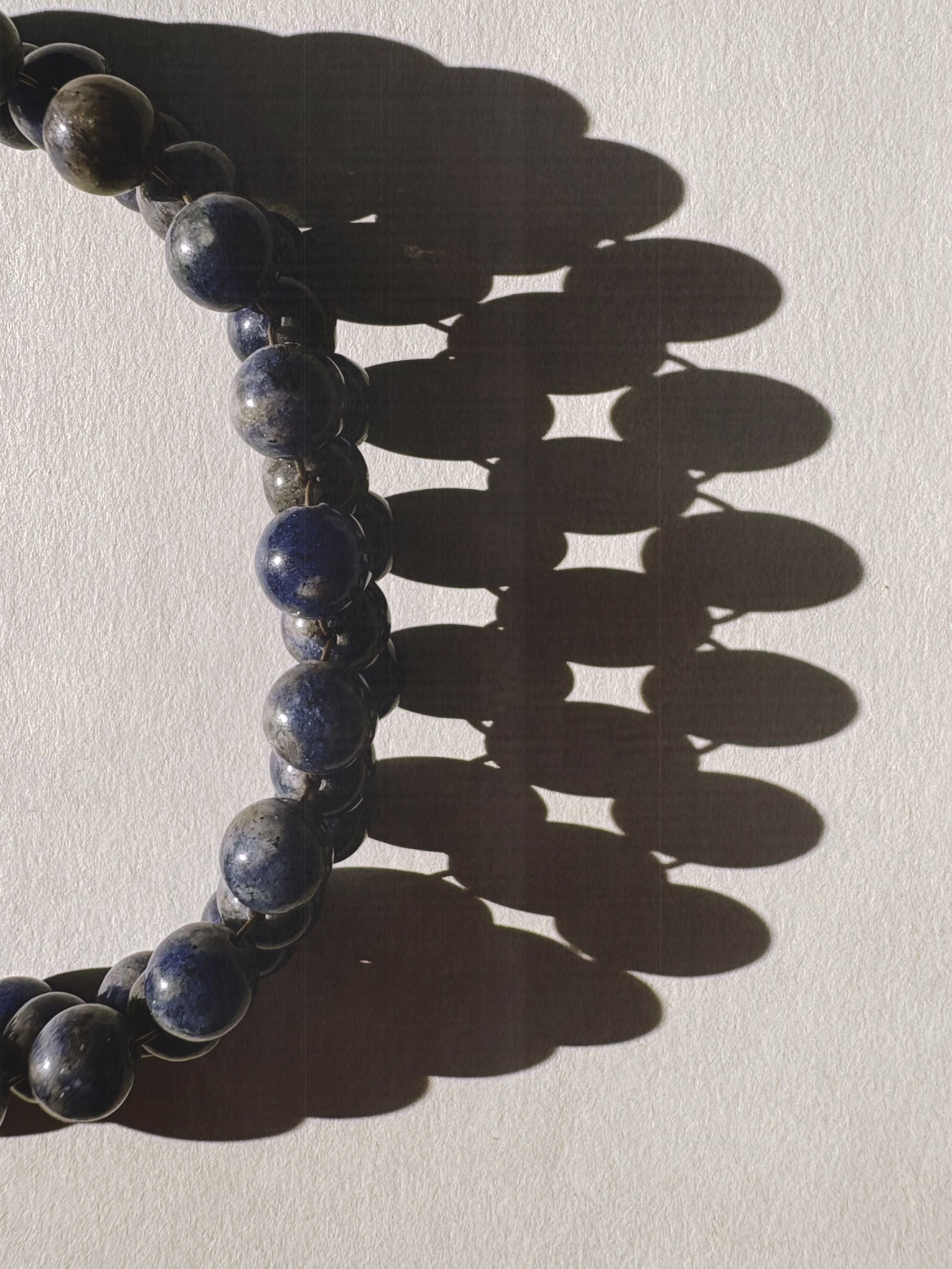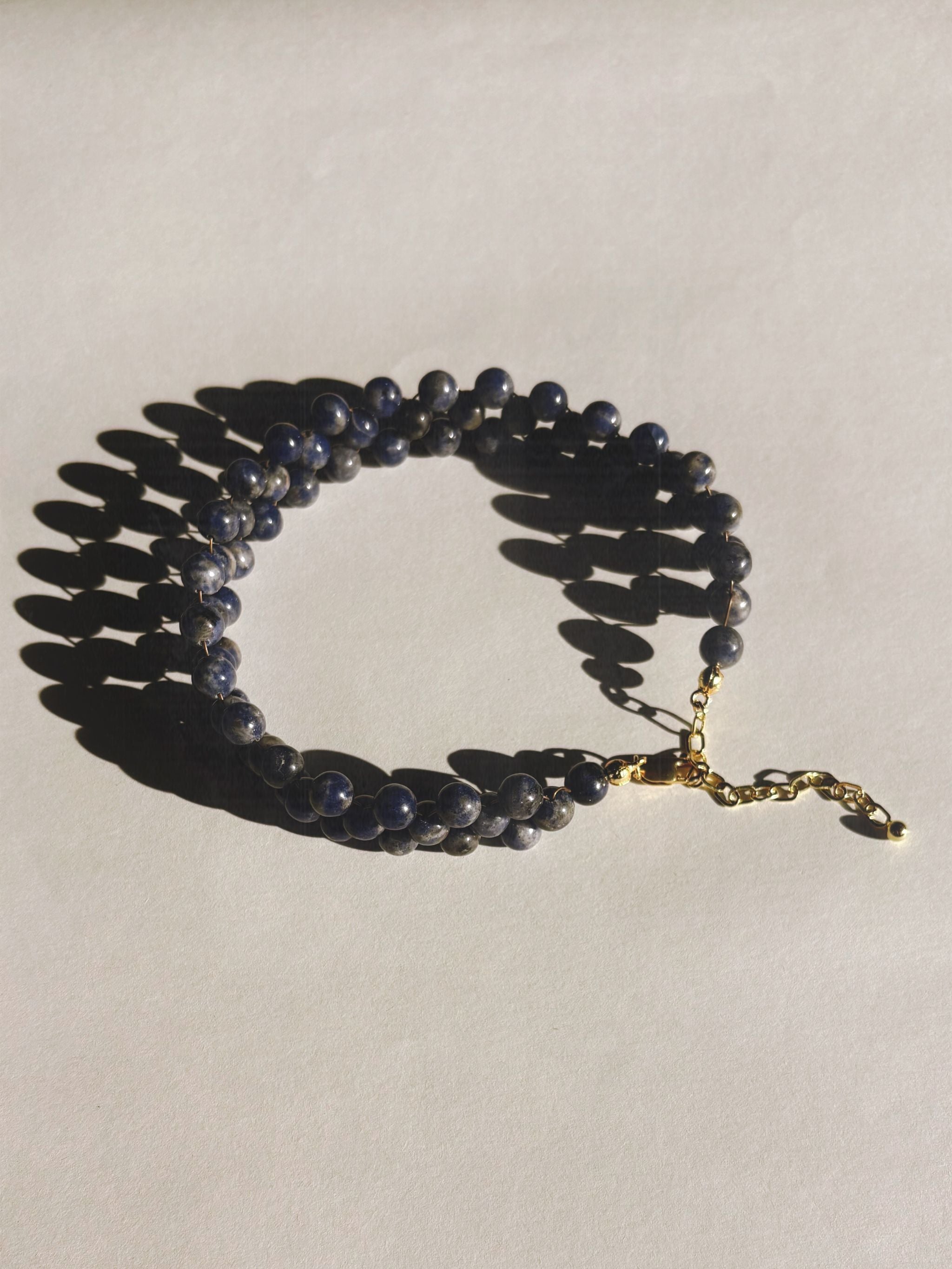 Hand-woven with polished Sodalite spheres that glimmer between dark and pale blue.
